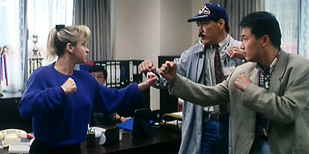 “City Cops” (1989):Here our heroine is FBI agent “Inspector Cindy,” who comes to Hong Kong to fight crime in warehouses, alleys, office buildings and airports. Featuring the spectacular Receptionist’s Desk Roll. We also get a comical cop duo, a martinet police superintendent, and an extended opening riff on gender that would be impossible to make today.